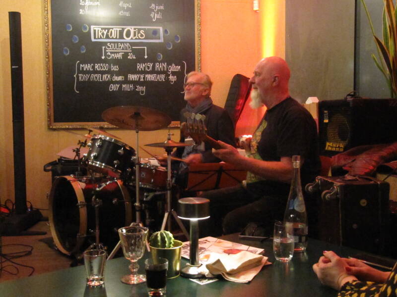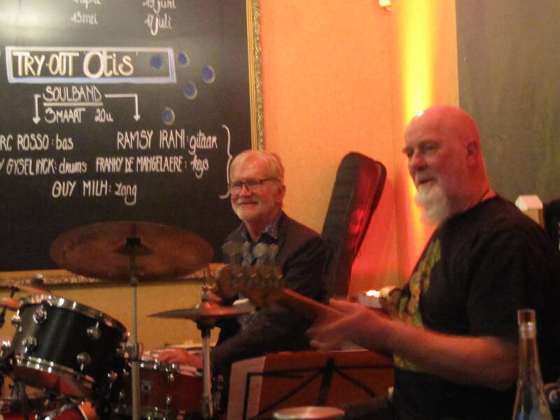 Iets na achten stapten de bandleden het podium op. De band bestaat uit: Marc Rosso (basgitaar, sessiemuzikant die speelde bij Soulsister, De Kreuners, Jean Bosco Safari), Tony Gyselinck (drums, sessiemuzikant die speelde bij Roland, Jo Lemaire, Toots Thielemans), Ramsy Irani (gitaar en zang, die ik al aan het werk zag met het trio Odevida), Franky De Mangelaere (keyboard, tevens leraar piano) en Guy Milch (zang & percussie, zingt ook in soul & pop coverband, en zelfs met een big band).