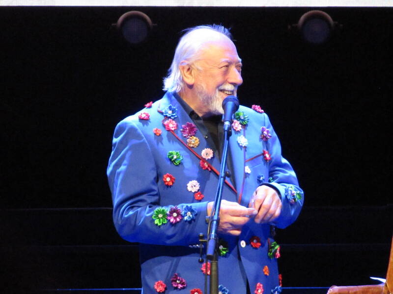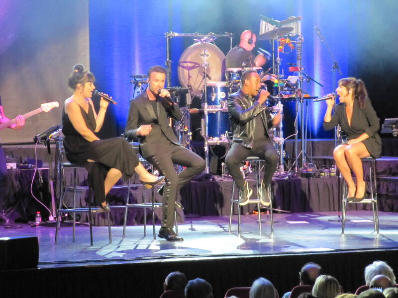 Nadat we terug plaats genomen hadden, kwam Rita op in gezelschap van haar 3 “voice brothers” uit ‘The Voice Senior’, namelijk John Wooley, Karel Meganck en François Van den Broeck, plus haar dochter Jessy. Rita zette in met een opgewekte versie van ‘Rose Garden’, gevolgd door het duet ‘Don’t Go Breaking My Heart’, waarbij zij samen met John in de voetsporen van Elton John & Kiki Dee traden. John nam nadien het voortouw als “soul brother” met Michael Bolton’s versie van de Bee Gees hit ‘To Love Somebody’. Daarna liet hij Joe Cocker’s versie van Aretha Franklin’s ‘Chain of Fools’ volgen, en Karel stond hem bij op mondharmonica. Karel ging vervolgens in duet met Rita op Count Basie’s ‘Everyday I Have the Blues’, om te vervolgen met ‘I Put a Spell on You’ en af te sluiten met een Franse chanson, namelijk Gilbert Bécaud’s ‘Et maintenant’. Aansluitend nam François Van den Broeck de micro ter hand om samen met Rita het duet ‘Cheek to Cheek’ te brengen, met alweer Karel die voor ondersteuning op mondharmonica zorgde, waarna het volgende duet ‘All of Me’ volgde. François trakteerde ons daarna op een stomende versie van Michael Bublé’s ‘Feelin’ Good’, dat eigenlijk oorspronkelijk een hit was voor Nina Simone. Maar François is in de eerste plaats verknocht aan Frank Sinatra en liet ons zijn live versie van ‘The Lady Is a Tramp’ horen. Restte enkel nog dochter Jessy die het voortouw nam met Adele’s ‘Easy’ en dat op verzoek van haar moeder. Maar we naderden de finale en Jessy koos ervoor om de pannen van het dak te zingen met een geweldige uitvoering van Stevie Wonder’s ‘Superstition’, waarop Karel ook weer de mondharmonica ter hand nam. Het ging erin als zoete koek, als aanloop op de finale waarin ‘I’ve Got the Music in Me’ (Kiki Dee) door allen samen gebracht werd. Het publiek in de zaal veerde recht en op de opzwepende tonen van ‘Proud Mary’ werd er spontaan gedanst. John begaf zich even tussen het publiek.