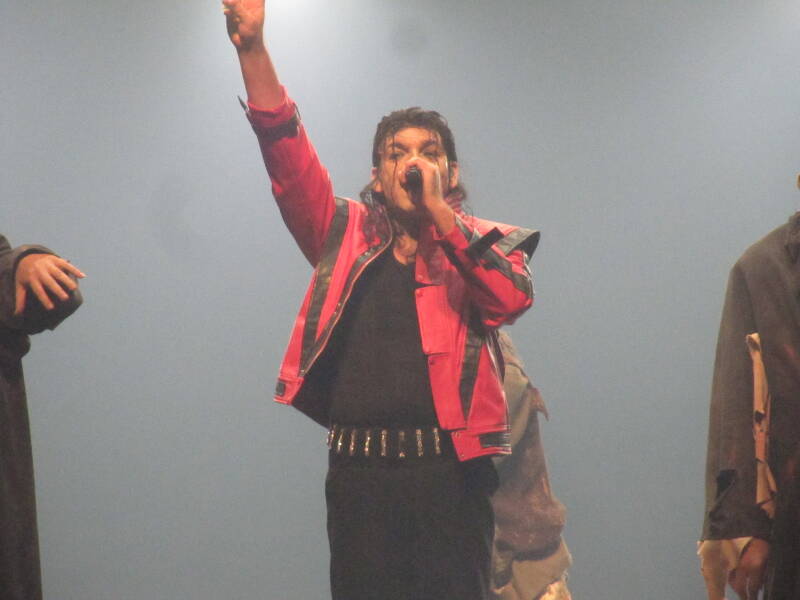 Na een half uurtje konden we de zaal weer betreden voor de eerste tonen van ‘Thriller’ met weerom ‘Who’s Bad?’. En toen zette Christ’OF er weer de beuk in met ‘Beat it’ in het beroemd geworden rode jacket, waarin een bendeoorlog uitgebeeld wordt. Nadien wisselde hij dat voor een wit jacket om ‘Black or White’ te brengen, met wat rap tussenin. Een troon in de vorm van een M werd op het podium gebracht met rode doeken erover gehangen. Christ’OF nam er plaats in en dook na een verdwijntruc zowaar midden in de zaal op. ‘Dirty Diana’ werd de volgende track, met een gierende gitaarsolo erin, waarna hij traag ‘The Way You Make Me Feel’ inzette, om daarna volle bak los te gaan met een sexy danseres. En toen verscheen een danseres zo weggelopen uit het Charleston tijdperk, die hem hielp aankleden voor ‘Smooth Criminal’. Aansluitend werd een jazzy nachtclubsfeer gecreëerd als opening voor Christ’OF, die opkwam en zichzelf aankleedde uit een koffer, compleet met glitterkousen en dito handschoen, voor het succesnummer ‘Billie Jean’. Ik weet ondertussen ook dat dit zijn persoonlijk favoriet MJ nummer is. Daarna droeg hij een song aan Michael zelf op, en dat werd de ballade ‘Gone too Soon’ waarop hij ons vroeg “show him some love”. Op de eerste tonen van ‘Thriller’ wist ik al hoe laat het was, weerwolven huilden op de achtergrond en een deur kraakte. Het griezelsfeertje was er, de zombies kropen het podium op en dansten samen met hem. Dat werd uiteraard één van de hoogtepunten van de show, waarna hij ons vroeg “Do you want some more?”. Dat wilden we maar al te graag, en Christ’OF’s tweede keuze ‘Man in the Mirror’ kwam eraan. Deze song heeft een diepere betekenis, want hierin zong Michael indertijd “als je de wereld wil veranderen, begin dan bij de man in de spiegel, ofwel jezelf”. Dat zouden we allemaal moeten ter harte nemen!