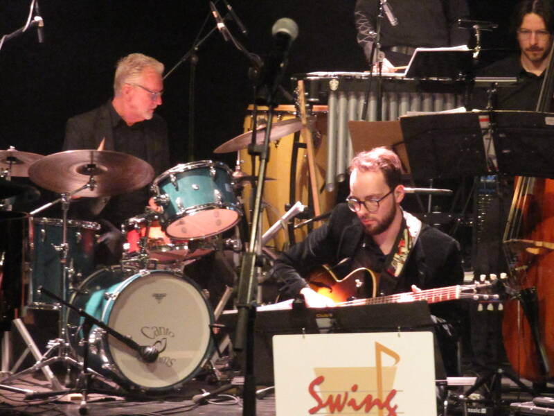 ‘Sweet Georgia Brown’ luidde het begin in, in een arrangement van Nostico, waarna overgeschakeld werd naar de Beatles cover ‘A Hard Day’s Night’ uit de gelijknamige film uit 1964. Swing Time Society koos voor de versie van Count Basie, gevolgd door de Glenn Miller sound (die niet mocht ontbreken) met het bekende ‘Tuxedo Junction’. Vervolgens kwam zangeres Chantal Marchand op het podium om de Peggy Lee cover ‘Kansas City’ te vertolken. Dit nummer van Leiber & Stoller kwam er in een arrangement van Q. Aansluitend zong Chantal de standaard ‘Alright, Okay, You Win’ in, ook weer met een arrangement van Quincy Jones. Een instrumentale versie van Vince Guaraldi’s ‘Skating’ was de volgende track, vertolkt door het combo samen met 2 fluitisten. Neil Hefti’s ‘Girl Talk’ volgde daarna, terwijl met Thelonious Monk zijn ‘Blue Monk’ de blues in bebopvorm aan de beurt kwam. Iets recenter waren dan Diana Krall’s versies van ‘Come Dance With Me’ en ‘It Could Happen to You’, beiden weerom gezongen door Chantal. De “Duke” (Ellington) zorgde voor ‘In a Mellow Tone’ en met Cole Porter’s bekende ‘Love for Sale’ werd dit eerste deel afgesloten. Ik vergat nog te vertellen dat achter de Big band foto’s en afbeeldingen van elpees geprojecteerd werden op een groot scherm.