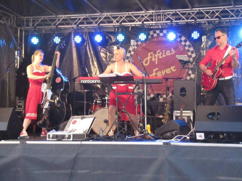 Maar ik was vooral afgezakt voor Fifties Fever, een band die bestaat uit een zangeres, die tevens keyboard, sax en een mandoline bespeelt, een contrabassiste, een drumster, en een gitarist, die soms ook zong. Ze brengen rauwe, opzwepende rock ‘n’ roll uit de jaren vijftig van de vorige eeuw, maar ook soms country en andere genres.