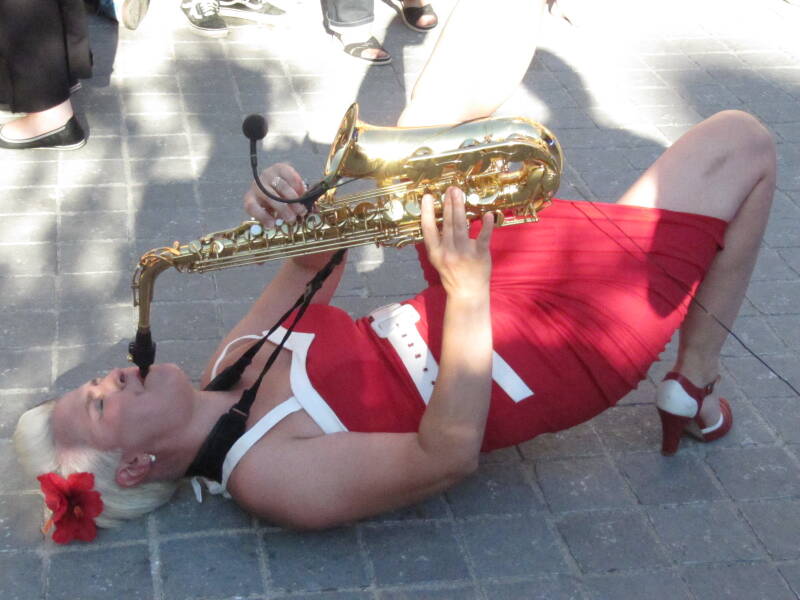 Even na zeven uur werd steevast ingezet met het rockende ‘Great Balls of Fire’, en daarop volgde ‘Johnny B. Goode’. De sfeer zat er onmiddellijk in. Een onvermijdelijke Elvis medley mocht niet ontbreken en die kwam eraan met ‘Jailhouse Rock/Don’t Be Cruel/Hound Dog/Teddy Bear/That’s Allright (Mama)’. Mensen begonnen spontaan te dansen, waarna een mij onbekende song volgde. ‘Hava Nagila’ zou eerder passen een Joods feest, maar werd hier opgevoerd in een rockachtige sfeer, waarbij de saxofoniste zowaar op het plein op de grond ging liggen. Uit de Motown staal kwam ‘Do You Love Me?’ van The Contours, gevolgd door ‘Folsom Prison Blues’. Het publiek was snel om te dansen op de wereldberoemde ‘Hucklebuck’ en deed dat aansluitend ook op ‘Let’s Twist Again’. Dan was het tijd voor een nummer van Jerry Lewis, gevolgd door een aangepaste cover van Springsteen’s ‘Dancin’ in the Dark’.