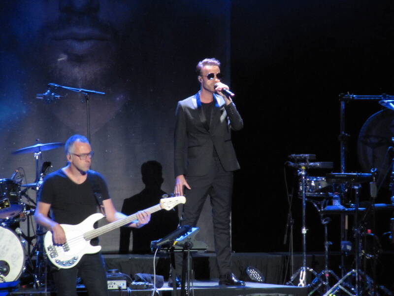 Een loeiende politiesirene luidde de disco swinger ‘Outside’ in, en Ivann en zijn dansers verschenen in politie-uniform met bijbehorende pet. Aansluitend bracht ‘Amazing’ handgeklap op gang uit de zaal. De slow ‘One More Try’ volgde daarop, en wanneer een sofa op het podium gedragen werd, begreep ik onmiddellijk dat het tijd was voor ‘Jesus to a Child’. Twee dansers beelden het gevecht tegen AIDS uit, want George schreef deze hit nadat zijn geliefde daaraan gestorven was. Ivann nam plaats in de zetel en bracht een mooie, ontroerende versie ervan. En toen was het “party time” met de medley ‘Killer/Papa Was a Rollin’ Stone’, waarop prompt het publiek rechtveerde. Als inleiding vertelde hij ons toen dat het te duur was geweest om Elton John af te laten komen voor het duet ‘Don’t Let the Sun Go Down on Me’, en aldus bracht hij dit samen met een achtergrondzanger. Daarna rechtte iedereen zich opnieuw om te dansen en met de armen te zwaaien op de tonen van ‘Freedom’. Ivann stelde de bandleden voor en vervolgde met een hit uit zijn geboortejaar, namelijk de Wham! hit ‘I’m Your Man’. En ging daarna verder met ‘I Don’t Want Your Freedom’. En dansen was nog steeds aan de orde op ‘Wake Me Up Before You Go-Go’.