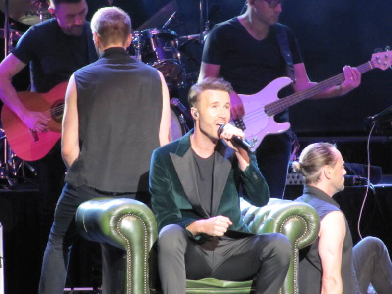 Het doek ging open, en 3 dansers dansten op de intro van ‘Cowboys & Angels’. Ivann zelf was nog onzichtbaar, maar je hoorde hem al. Toen het tweede doek omhoog ging, zag je de begeleidingsband, die bestond uit een saxofonist, een drummer, een gitarist, een bassist, een percussionist en keyboardspeler. Ivann zelf kwam dan op met ‘Prayin’ for Time’. Daarna kwam de titelsong van deze tour eraan, ‘The Edge of Heaven’, met weerom dansers. Op deze hit van Wham! kwam er ambiance in de zaal. Aansluitend bracht Ivann nog een Wham! hit, ‘Everything She Wants’, maar dan gezeten op een barkruk, met 3 achtergrondvocalisten naast hem. Op de tonen van de hit ‘Fastlove’ klapte de zaal mee, gevolgd mijn favoriete George Michael nummer, ‘Kissing a Fool’. Ivann vertelde hierbij dat we ons een rokerige jazzclub moesten voorstellen, met een contrabassist en een pianist, overigens zo weggelopen uit de bijbehorende videoclip. Drie dansers vielen hem bij, en ja hij verklapte ons dat dit ook één van zijn favoriete nummers is. De cover ‘I Can’t Make You Love Me’ was de volgende in het rijtje, en op de intro van ‘Father Figure’ verdween Ivann even van het podium. De drie dansers kwamen in zijn plaats, waarna hij met een akoestische gitaar in een leren jack verscheen om het dansnummer ‘Faith’ in te zetten. En de zaal veerde recht! Daarna vroeg hij “do you want more?” waarna er een extra stukje aan gebreid werd. Een lange saxofoonintro luidde vervolgens de miljoenen hit ‘Careless Whisper’ in, wat overigens George’s eerste solosingle was. En een koppel in de zaal ging zowaar slowen!
