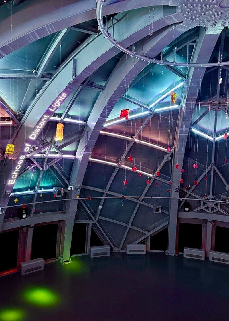 Daarnaast worden op de onderste verdieping beelden van hemellichamen, vastgelegd door de Hubble- en James Webb-telescopen, geprojecteerd op fosforescerende oppervlakken. Het langzaam vervagende beeld suggereert afstand en het verstrijken van de tijd en verbindt het verleden van de kosmos met het heden op aarde. Maar door de lichtinval waren deze niet al te duidelijk te zien.