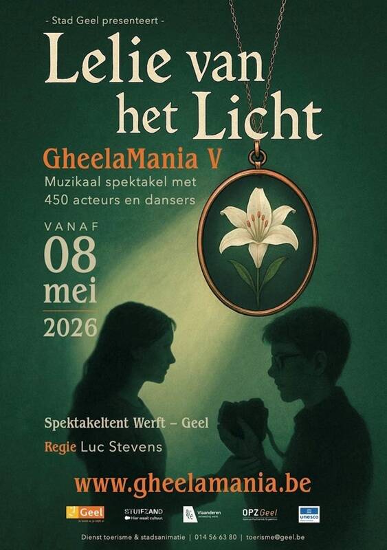 Vanaf 8 mei 2026 strijkt GheelaMania V: ‘Lelie van het Licht’ neer op het plein voor het stadhuis van Geel. In een indrukwekkende tent en adembenemend decor zullen ruim 400 acteurs, dansers en figuranten - in een regie van Luc Stevens - het beste van zichzelf geven.